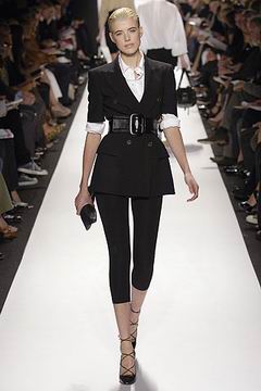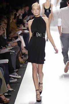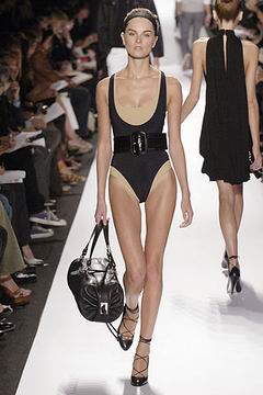 在几款休闲和体操装束之后,Kors展示了有漆皮宽大的系肚带和如蟒蛇般粗宽皮带的各式服装,包括超紧身的晚礼服系列,让人惊艳!同时也将Kors独到不凡的设计功力表达得淋漓尽致。