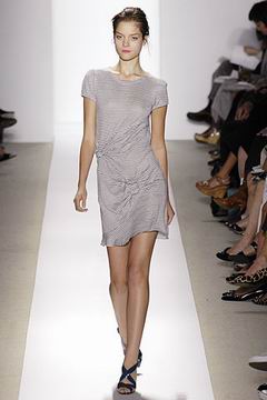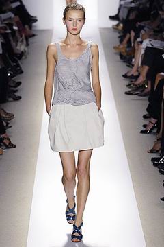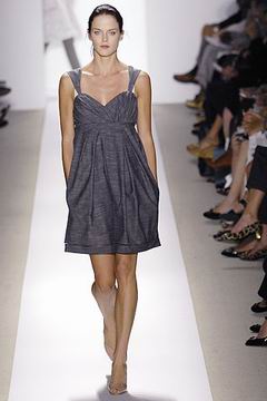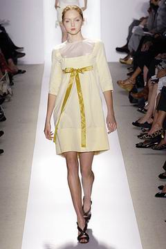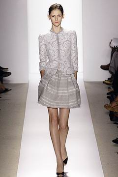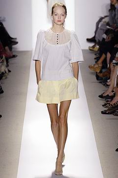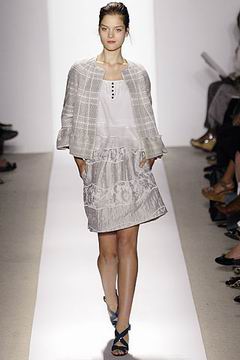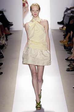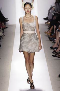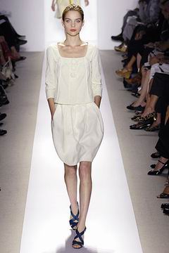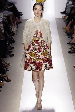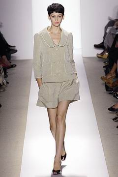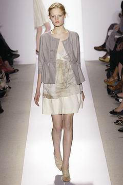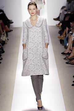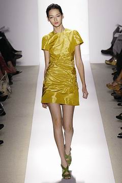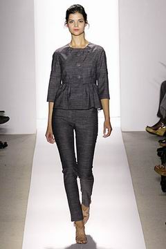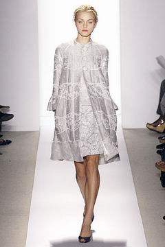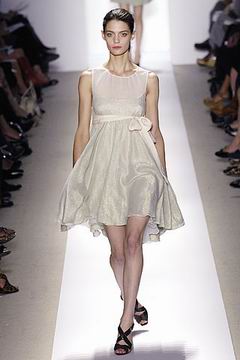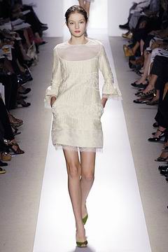 各种深浅不一的渐层光泽弥漫在本季的服装系列中,如鸽灰到白脱牛奶,以及强调彩妆才会有的疯狂色系于各式鞋款,以往来说,Som擅于强调光泽度而非闪亮度,本季也不例外,衣料上则采用提花织布与粗麻布,触感犹如羊皮纸质,在整体系列中大部分为较有个性的春夏休闲款、或是奢华亮丽的礼服款,均不太适合女性上班族群,不过也因此显示出Peter Som不同以往的才华,令人着迷。