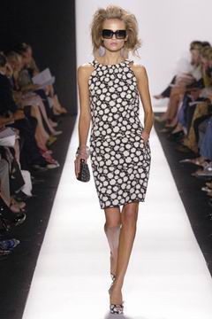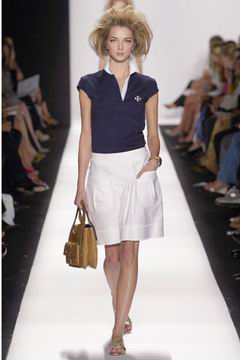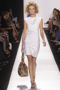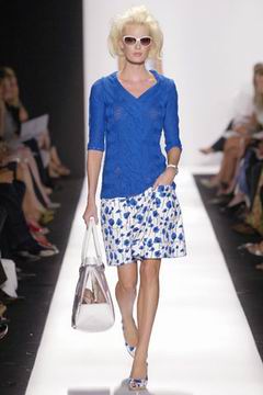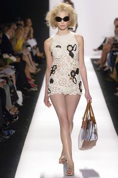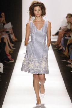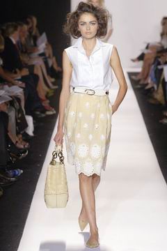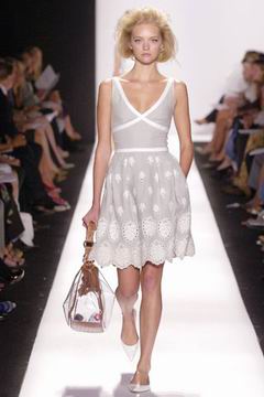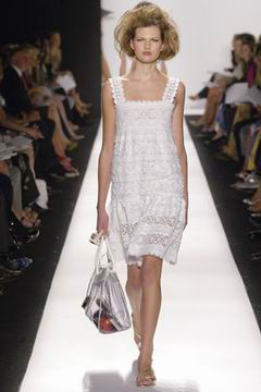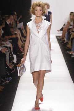 即便强调贵气,设计师却仍然保持青春款式剪裁,例如长达膝盖的短袖束腰外衣,运用塔夫绸与丝绸所制作的海军蓝礼服、泡泡袖设计、V领俏丽的Polo短衫等等,镶上之前秋季的华美水晶扣,最后在Jacquetta Wheeler高雅的白色蕾丝花礼服中,结束了这场无比完美的精采演出。