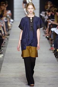 合身却宽松的线条在中性的外型下,设计师匠心独具将衬里缀以蕾丝、无袖的马德拉斯棉布上衣以及彷如睡裤般松垮的外出裤,则以丝绸质料带出高雅与飘逸;相当不同于其它设计师,Derek Lam 运用无性别的概念,打造风格独特的晚宴系列:海军蓝与宝蓝的穿插点缀、希腊女神模样的及地宽大罩袍以别制的饰带镶缀、全系列简洁流畅的线条不但实穿易搭、更是Derek Lam个人风格的经典展现 。