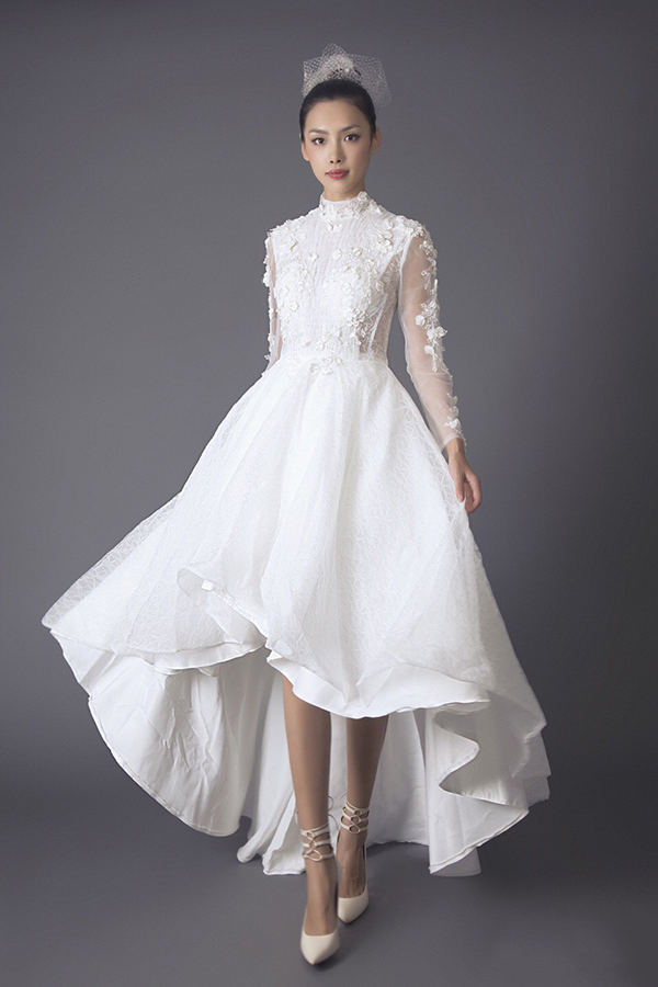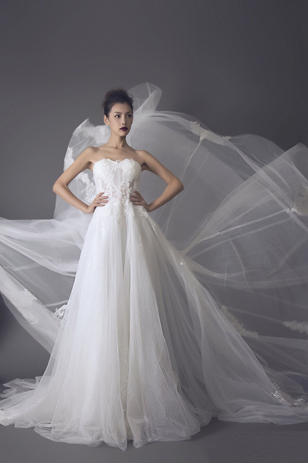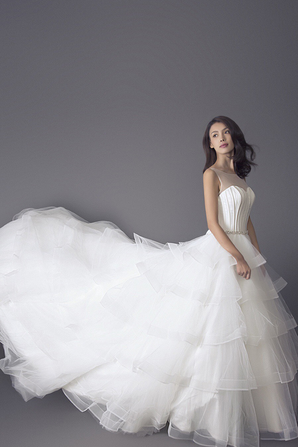 NEWFACE第97期高级实践班优秀毕业学员汤荣婷,在最新一组时尚大片中,或曳地鱼尾婚纱,或露肩式小礼服,或复古衬衫式收腰长裙,在圣洁的白色婚纱笼罩下,变身优雅端庄的美丽新娘。
