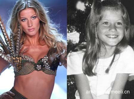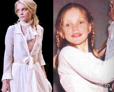 加拿大超模Jessica Stam鼻子娇俏,嘴巴淘气地像总是微微嘟着似的。右边应该是她8,9岁的样子,怀抱她心爱的洋娃娃,门牙间有很大的缝隙。后来她担当过Miu Miu、Versace、BCBG等的广告女郎,行过几乎所有的国际大牌时装秀。Marc Jacobs推出的那款Stam包,就是以她为灵感命名的。