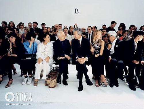 这是2001年Dior Homme开场Show的第一排,分别是(从左至右):VOGUE法国版的时尚编辑Emmanuelle Alt,川久保玲,《国际先驱导报》的时尚编辑Suzy Menkes,前任YSL总裁Pierre Bergé,LVMH总裁Bernard Arnault及其女儿Delphine Arnault,Karl Lagerfeld,《V》的创办人Stephen Gan。对于所有人而言,这场Dior Homme Show不过是米兰众多Mens Collections 其一。Dior 在01年以前也只有女装,男装不设designer。然而这个萎靡不振的Line 在Hedi Slimane 的带领下几乎颠覆了10多年来的Hi-Fashion,男女通杀,当之无愧成为世界男装头牌。Kris Van Assche就像《蝴蝶梦》里的女主角陷入前任女主人无所不在的阴影中,Dior Homme这杆大旗要怎样来扛?