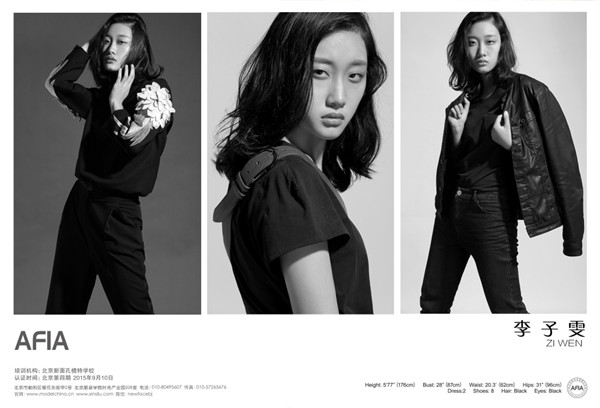模特卡中的李子雯是AFIA第四期认证模,主打黑蓝色调的她,性感而神秘,带着大女人的知性和小女人的柔美,雕塑型的脸,流畅的线条,镜前表现细腻而成熟。