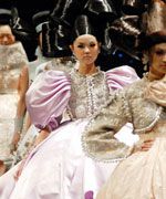 在香港发展如日中天的名模张雪近日因北京国际服装周返京,于前日以芭比娃娃造型亮相著名设计师郭培玫瑰坊高级订制时装专场发布会。