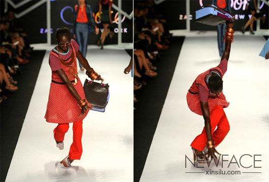 原籍苏丹的18岁超模Ataui Deng不慎被脚上的银色高跟鞋绊倒