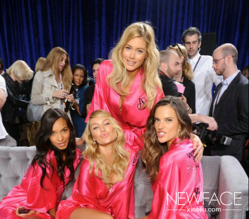 图为超模合影,站立模特为杜晨·科洛斯 (Doutzen Kroes),坐着麻豆(由左到右)依次为:莱丝·瑞贝罗(Lais Ribeiro)、坎蒂丝·斯瓦内普尔(Candice Swanepoel)和亚历山大·安布罗休(Alessandra Ambrosio)。