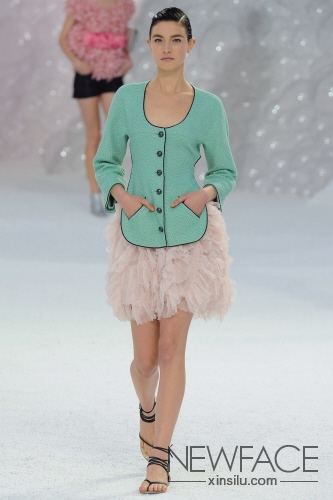 Chanel 由卡尔·拉格菲尔德在香奈儿的秀场上推出了许多美人鱼外观,这成为大众的舆论和报刊的封面。这种外观具体表现为轻盈的感觉,同时具有诱惑消费者的十足的香奈儿符号。色调也突出了此季色彩趋势的关键,水绿色和柔和的粉色。