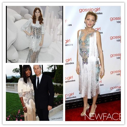 流苏是20装饰艺术风的另一个主要细节,各种样式的流苏出现在直筒长礼服的裙摆或肩部,或装点着妩媚妖娆的酒会连衣短裙。无论从Naomi Campbell到Florence Welch,流动的丝质长流苏完美演绎奢华艺术风。