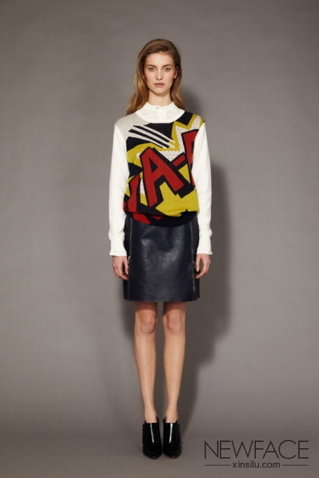 Phillip Lim决定在早秋系列中有所作为。与他合乎趋势的粉彩色春夏系列运动装有所不同,这次他从新黑色漫画丛书中得到灵感,打造出令人意外的时尚造型。Phillip Lim坚称 “每个人心目中都想穿着得像'超级英雄'一样”,于是他以极具视觉冲击力的红色、明黄和少量的金属色以及口号标语图案搭配简洁利落的线条、塑造出类似漫画人物或超人般的惊世骇俗的形象。叠穿设计是这个系列的核心,简约的箱型夹克和外套搭配修身裤子,内穿衬衫连衣裙、束腰贝壳上衣或短款 A 字百褶裙。总体来说,撇开几套出位的服装,大多数的设计其实还是非常实穿而商业化的,而新漫画元素无疑成为讨好年轻市场的 “幌子”。