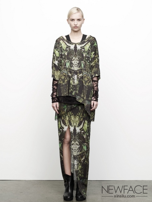 Helmut Lang总是偏爱从古怪的艺术家或晦涩的文艺作品中寻找灵感,而他们本季的灵感来源听起来则匪夷所思:据说他们从喂食了咖啡因后的蜘蛛结出的网和一般的蜘蛛织出的网不同这一“咖啡因蜘蛛”理论中得到灵感,并进而把这一理论的网状元素扩充运用到了本系列的服装中。系列中主打的是不对称的松散针距蛛网式针织、做旧紧身牛仔裤和百褶机车夹克等。无数杂乱剪裁的网状图案、数字化烂花印花和粗斜纹棉布拉绒后的黑白相间做旧效果印证着“咖啡因蜘蛛”影响下的印花或图案主流;大量落裆设计、非对称下摆、不规则长度、折纸艺术风格百褶、曲线式独特线缝等细节带来意外之外的惊艳。