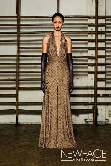 Givenchy的装饰未来主义 Givenchy by Riccardo Tisci 2012春夏高级定制服依然只有十套,依旧哥特。不过,Riccardo Tisci把目光从天堂、日本情怀转向了未来主义。不过,这种未来主义是上个世纪20年代的默片中提取的灵感:1927年Fritz Lang的科幻史诗《大都会》与1924年苏联科幻片《火星女王艾丽塔》,那些带有Art Deco风格的未来主义。