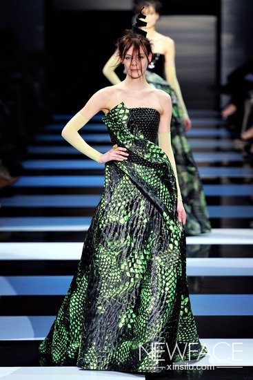 Armani Prive的昆虫变形记 Giorgio Armani为这一季高级定制服定下的主题是“变形记”,破茧成蝶、巨蟒脱壳等自然蜕变成为设计师Giorgio Armani本季的灵感来源。那些甲虫幼虫般的绿色成为了Armani Prive 2012春夏高级定制秀的主题色……别致的色调与闪闪发光的亮面材质,同时也营造出超现实感的时装。