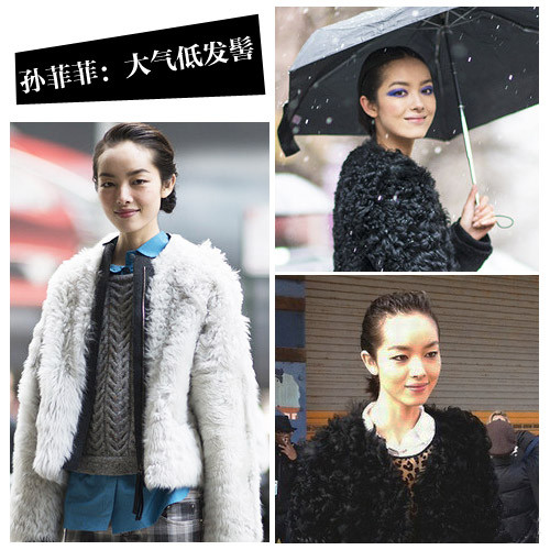 场外街拍:大气低发髻。此次秋冬时装周的场外,孙菲菲的发型也很有个性,同样是低发髻,却以发尾的细节变身不同的风格,她还善用眼妆颜色,让整个造型显得大气有层次。
