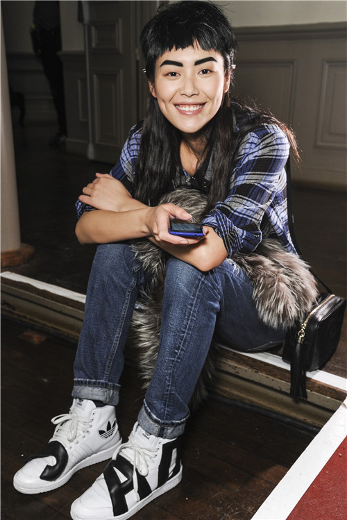 候场中的刘雯 粗眼线重眉毛一脸灿烂笑容
