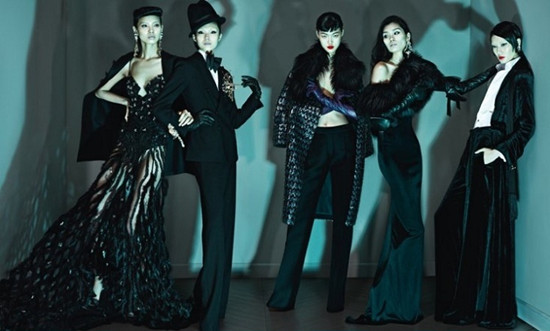 高国芝、雎晓雯、游天翼、奚梦瑶、贾静五位国模共同出镜2013秋冬Dsquared全新广告大片。
