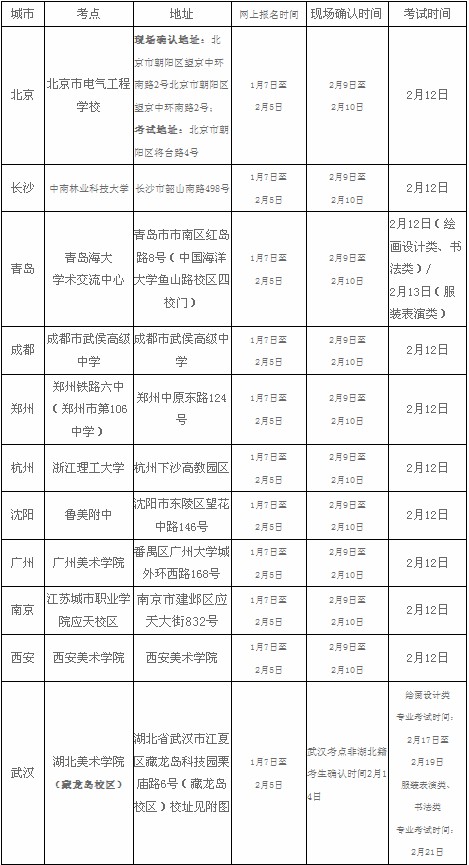 湖北美术学院2014年普通本科招生专业考试考点设置及报名考试时间安排