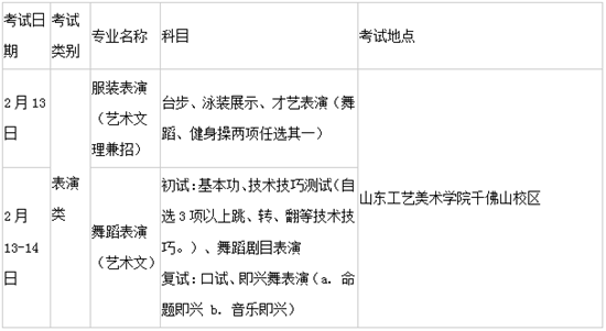 4、服装表演、舞蹈表演专业报名时间为2月12日。报名地点:山东工艺美术学院千佛山校区(济南市千佛山东路23号)