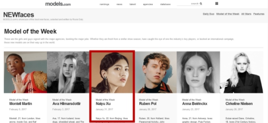 models.com的“NEWfaces”榜单素有“超模风向标”之称,NEWfaces模特也成为国际知名时尚品牌的首选,众多炙手可热的国际超模都曾入围此榜单。来自中国的新面孔模特学员也是这个榜单的常客,除了徐乃郁,如今已经成为国际名模的何穗、张丽娜、侯梦蝶、薛冬琪和尚宏庆也都曾入围。作为入选本季“Models of the Week”的唯一一位中国女模,风格上与何穗相近的徐乃郁或将循着她新面孔学姐的足迹,成为中国超模新一代的领军人物。