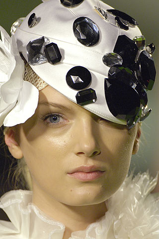 她07年春夏,穿着hermes的纱制外套,灰色短裤,脚下是厚底的凉鞋,同季,她穿着全白,拎着一只白色鳄鱼,走了chanel的秀,Lanvin的秀场,她戴的大眼镜马上就要掉下,穿着的米白色风衣十分有形,Jean Paul Gaultier的春夏秀,她穿着拉链皮衣,白色纱裙上场,立刻让人想起70年代的JPG,翻开一看才知道,原来真的叫做:1976 first collection,那年jpg设计了第一套,以自己名字命名的成衣,而搭配完全桀骜不驯的Agyness,贴切不过。