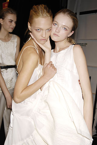 2008 S/S RTW 春夏女装成衣 -- Christian Dior ,后台和Anja Rubik, Morgane Dubled.走红程度:2001年秋冬时装周期间脱颖而出,人们谈论她最多的是他的热情惹火和天使般的纯真,以及她独特的猫步。